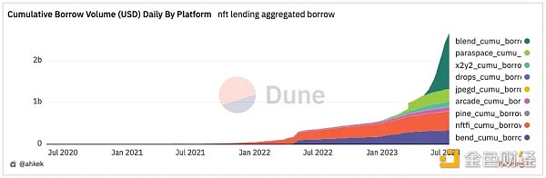 今年 4 月,NFT 借貸市場的累計交易額突破了 10 億美元,而在 Blur 推出其 Blend 平臺后,該市場最近在 6 月突破了 20 億美元的門檻。