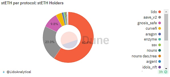 根據圖(1)-(5)可推算出各DeFi協議、錢包、流動池、DAO金庫等共持有stETH/wstETH總量大約為557萬枚,占據Lido產生的LSD總量的73.2%。可見,這些老牌 DeFi協議如AAVE、Uniswap、Compound、MakerDAO等成為了當前主流LDS資產的主要去處和應用場景。