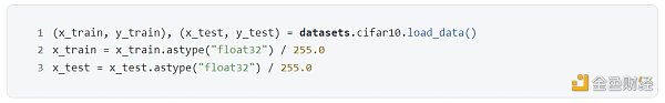 用模塊 datasets 里的 load_data() 函數來下載數據并對圖像的像素做歸一化,原來像素在 0 到 255 之間,現在歸一到 0 到 1 之間。