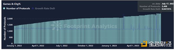 截止 2023 年 7 月 16 日,GameFi 的日平均活躍賬戶數約為 78 萬左右,現存游戲總數約為 2400 款左右,其中活躍游戲數量不足 200 款。