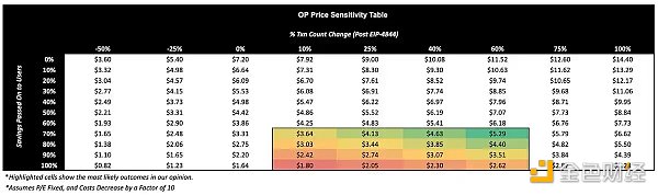 基于此,我們建立了一個表格,顯示了各種可能的結果,其中包括 EIP-4844 節省傳遞給用戶的不同組合(Y 軸)和 EIP-4844 成本降低因素(X 軸,數字越大= EIP4844 節省的費用越高)。