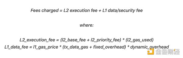 與 Arbitrum 類似,Optimism 的交易費用考慮了 L1 和 L2 計算的成本。Optimism 將其稱為 L2 執行費用和 L1 數據/安全費用。