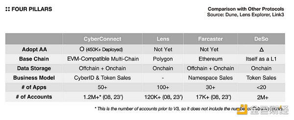 · 另一個最顯著的區別是“基礎鏈”。當協議依賴于特定鏈時,它可以快速吸收鏈的用戶群,這是一個好處,但也有壞處,例如無法自定義基礎設施配置和有限的互操作性。雖然Lens和Farcaster依賴于單鏈,但CyberConnect支持多個EVM兼容鏈,如Polygon、Linea、Arbitrum和Base – Optimism、opBNB,很快將支持更多鏈。DeSo認識到在通用鏈上實現Web3的局限性,因此它建立了自己的第一層,專門用于Web3社交圖譜。