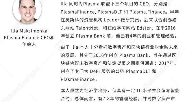 根據其官網的披露,PlasmaFinance由畢業于俄羅斯普列漢諾夫經濟大學的IliaMaksimenka創立并擔任CEO,但其余團隊信息并未披露。TokenInsight調研了PlasmaFinance的顧問團隊,顧問團隊共計8人,分別來自DencentraNet,MasterVentures,GreatTreasure,還有參與過以太坊網絡基礎系統架構的ValentinMihov。