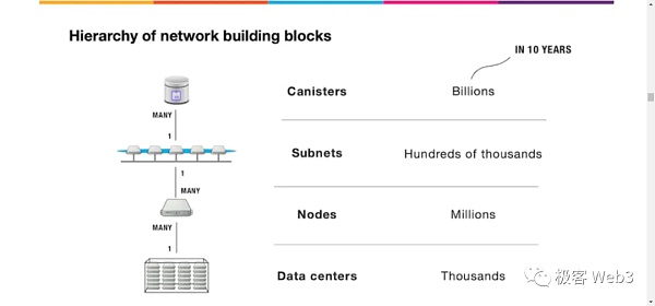 數據中心(Data Center):數據中心的節點通過節點軟件 IC-OS 虛擬化為一個副本(Replica),從多個數據中心中隨機選取一些 Replica 組成一個子網(Subnet)。這樣可以保證即使一個數據中心被黑了或者是遭遇天災了,整個 ICP 網絡還是正常運行的,有點像阿里巴巴 “兩地三中心” 容災高可用方案的升級版。數據中心可以分布在全世界各地,甚至以后可以在火星搭建一個數據中心。