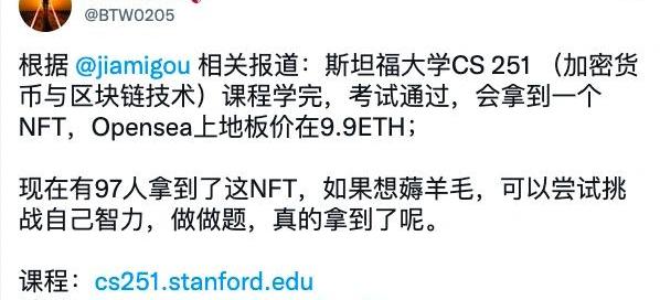 據推特用戶@0x.bitwu.eth分享,如果能夠完成斯坦福大學的CS251課程并通過考試,即可獲得一個憑證NFT,該NFT當前在OpenSea上的地板價高達9.9ETH,對自個智力有信心的朋友不妨一試。