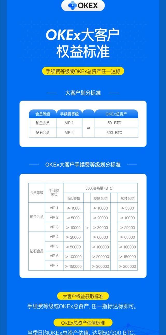 據了解,OKEXVIP大客戶分為鉑金會員和鉆石會員,平臺資產總量達50BTC或交易量達標即可申請加入。此外,大客戶資格將以季度為周期進行數據統計與篩選,每季度初會對符合資格的客戶以郵件或短信通知相關權益。