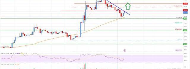 從圖表來看,萊特幣價格交投于98美元和55簡單移動平均線上方。總體而言,如果突破105美元阻力位,價格可能會開始新一輪上漲。