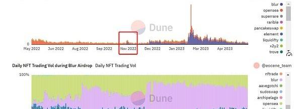 自2022年6月底,NFT市場進入熊市,但Blur于2022年底推出Airdrop激勵機制之后,NFT市場的交易量有所改善。在Blur的空投活動期間,可以看到其對于整個NFT市場交易量的貢獻不斷增大。