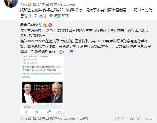 早些時候,媒體coinjazeera在社交平臺稱沃倫巴菲特取消與TRON首席執行官孫宇晨的慈善午餐,此消息被廣泛傳播引發關注。郎咸平教授也就在微博上轉發了這一截圖,并配文稱“挺有意思”。
