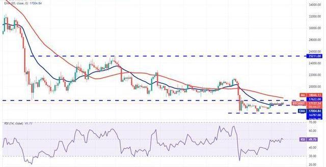 如果價格突破17,622美元和50天簡單移動平均線之間的阻力區域,BTC/USDT貨幣對可能預示著潛在的趨勢變化。然后該貨幣對可能會嘗試反彈至20,000美元,然后再反彈至21,500美元。