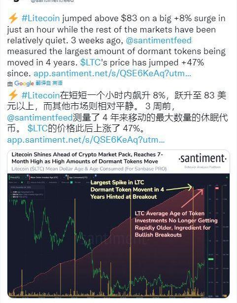 此外,該推文指出,幾個月來一直在積累和存儲LTC的大量錢包中的休眠代幣的移動是價格上漲至83美元以上并大幅上漲8%的主要因素。從歷史上看,休眠代幣的走勢是整個市場拋售壓力增加的跡象。然而,Santiment的分析并非基于LTC/USD的方向。同時,LTC/USD對的價值正在增加。