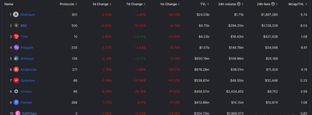 細分到各鏈,Solana最值得關注。其TVL月跌幅達到66%。目前TVL距離一年前的峰值100億美元,已經跌去97%,僅不到3億美元;在全部公鏈生態中,排名第11。