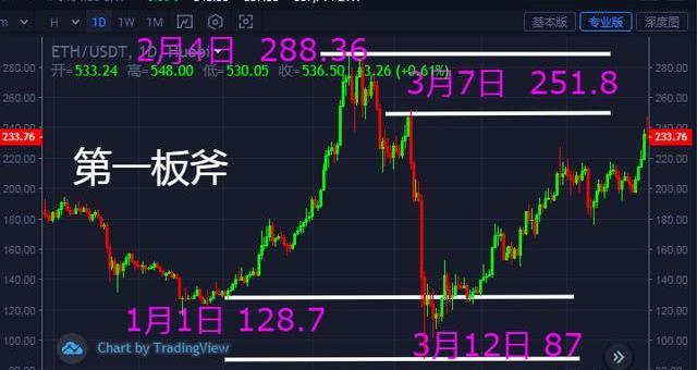第一次割韭菜手法:從3月7日——3月12日僅僅用了5天的時間這座巨樓開始崩塌,從251.8跌到87美元,穿過1月1日的128.7美元,不給交易者任何回調賣出的操作,瞬間割韭菜,這是本年度的第一板斧。
