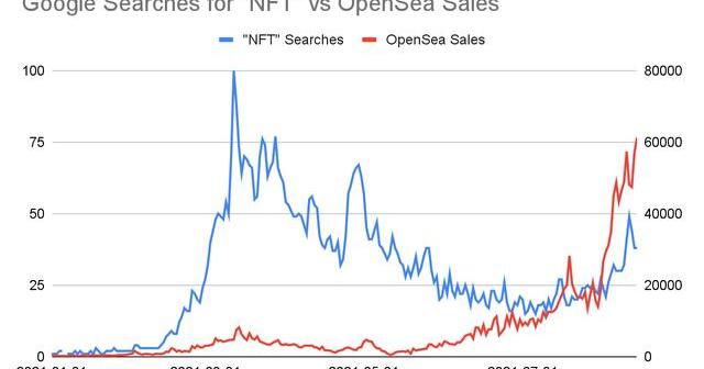 盡管近期OpenSea平臺上的NFT銷量猛增,但全球范圍內的“NFT”谷歌搜索量仍遠低于3月份峰值。如果NFT繼續吸引到外界關注,那么未來可能會出現更大的繁榮。