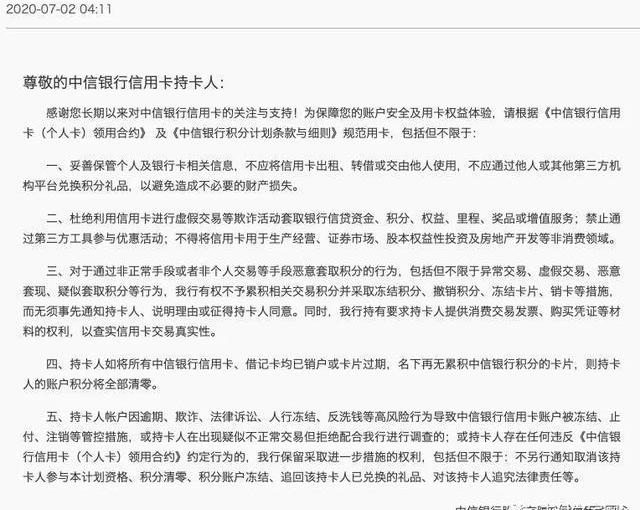 7月2日中信銀行發布關于進一步加強信用卡規范使用的提示公告。