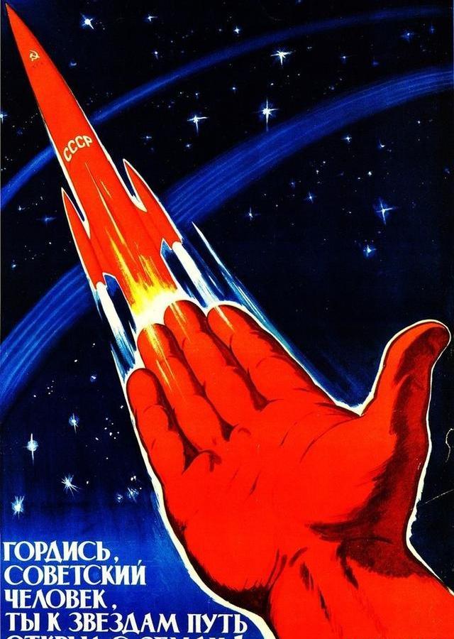 ▲蘇聯以加加林為主題的海報“童話成真”;宣傳戰是太空競賽中重要的一部分,美蘇雙方往往通過傳宣太空技術成功來體現自身的優越性