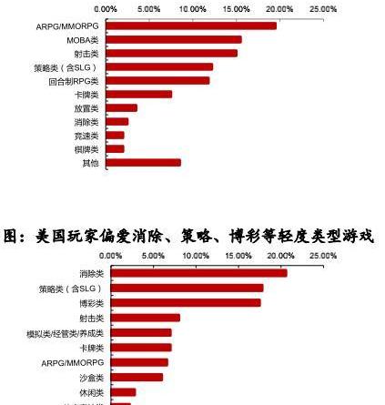 游戲類型和風格喜好不同。歐美玩家整體更偏愛休閑風格的游戲,而中國玩家中接觸網游較早的習慣于MMORPG,年輕用戶則青睞二次元,即使是時間碎片化的輕度游戲也是偏向放置類、MOBA等,都是相對來說開發難度高的游戲。