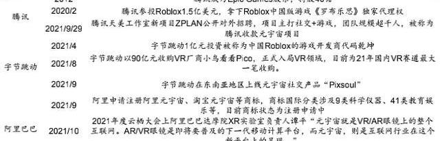 字節跳動:今年以來,字節布局元宇宙動作緊密,1月投資被稱為中國Roblox的游戲開發商代碼乾坤,8月以90億元收購VR廠商小鳥看看PICO,9月又在東南亞地區上線元宇宙社交產品“Pixsoul”。