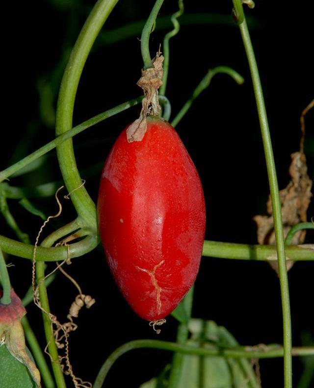 不過與百香果不同的是,百香果為圓球形或長條形的紫色、金黃色,但它卻形似“紡錐”,而且顏色鮮紅。因此,它也常用于庭院內的景觀植物種植。