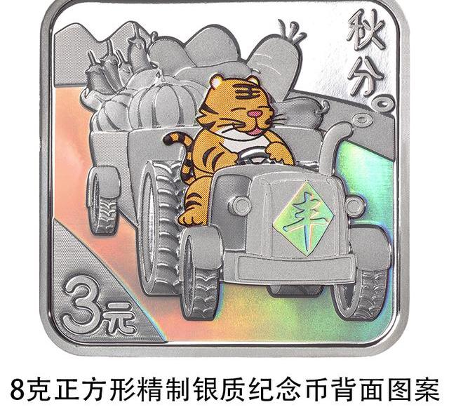 8克正方形銀質紀念幣背面圖案以虎、拖拉機、瓜果蔬菜為主要設計元素,展現秋分時節豐收景象,并刊“秋分”字樣及面額。