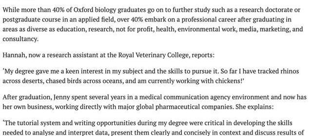 牛津大學表示:超過40%的牛津生物學畢業生在應用領域繼續深造,如研究博士或研究生課程。