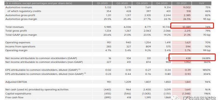 2021年特斯拉第一季度財報顯示,特斯拉已實現營收103.89億美元,同比增長74%,凈利潤4.38億美元,同比增長2638%。