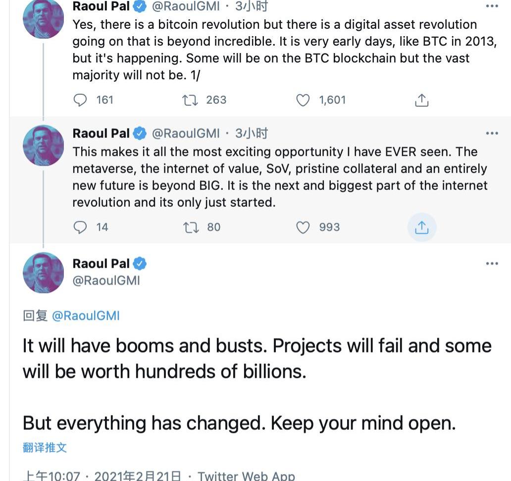 XRP/HKD+1.75%RealVision創始人兼首席執行官RaoulPal發推稱,“是的,是有比特幣革命,但數字資產革命正在進行,這是不可思議的。現在還為時過早,就像2013年的BTC,但它正在發生。一些會發生在BTC區塊鏈上,但絕大多數不會。這是我見過的最激動人心的機會。Metaverse、價值互聯網、SoV、原始抵押品和全新的未來都是巨大的。這是互聯網革命的下一個也是最大的一個部分,它才剛剛開始。它會經歷繁榮和蕭條。很多項目會失敗,有些項目則會價值幾千億。但是一切都變了。保持開放的心態。”