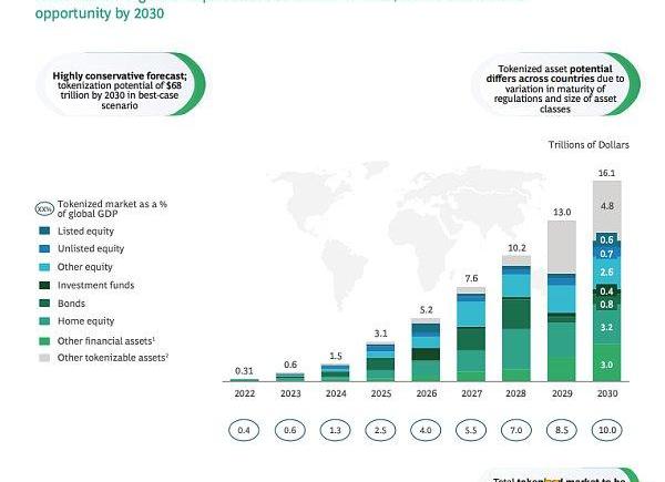 據波士頓咨詢公司預計,代幣化資產市場到2030年將增長至16萬億美元,或占到全球GDP的10%。