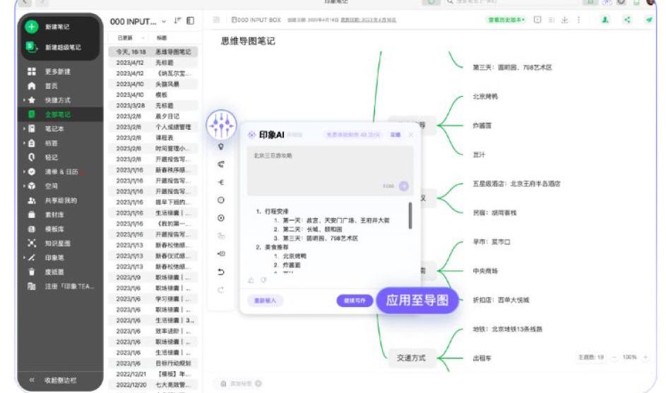 印象筆記是國內率先推出AI+輕文檔辦公軟件融合應用的創業廠商。其于今年3月中旬開啟內測,并在4月10日正式上線,目前只需下載印象筆記PC端Beta版,即可開啟印象AI功能。該功能處于免費公開測試階段,尚未作為付費功能來單獨收費。從具體功能上看,印象筆記所提供的AI輔助功能與NotionAI基本相近,包括了文章生成、作文生成、創意故事、提綱生成等。此外公司也將印象AI的能力融入了其旗下的其他矩陣產品,包括印象圖記、印象時間等。