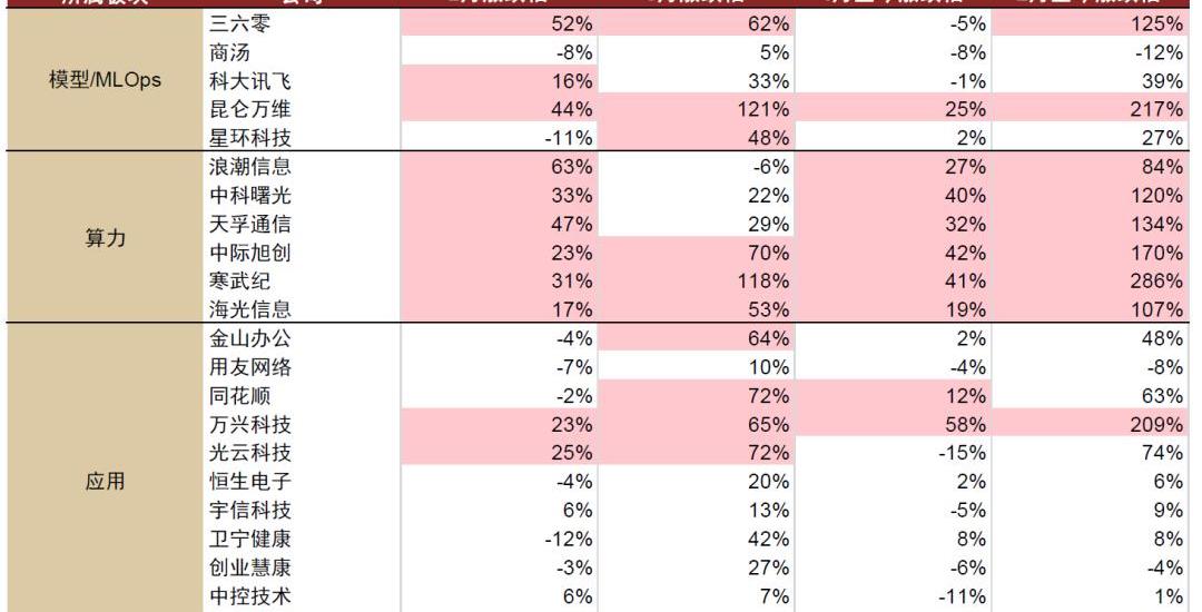 算力層:算力需求邏輯演繹較快,進入4月在細分賽道中漲幅居前。大模型發展尤其是前期訓練對算力的需求提升是較為直接且快速反應的,目前已經可以看到算力相關公司訂單和價格的邊際向上變化,算力層相關標的的投資邏輯最先得到初步驗證,因此進入4月后在AI細分賽道中普遍漲幅居前。算力層在整個AI板塊中率先演繹至第二層即落地兌現邏輯,包括國產GPU、服務器、光模塊等子賽道在4月份前三周的分化行情下,均仍有持續強勁的上漲表現。
