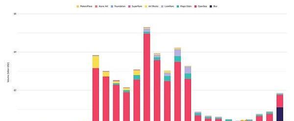 5、二月以太坊鏈上NFT市場交易額達到了18.6億美元,漲幅高達103.2%,這種上漲態勢主要由NFT市場Blur推動,隨著其BLUR代幣推出,Blur在交易量等指標上已超越了OpenSea。
