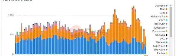 值得注意的是,盡管?NFT?交易者的活躍度很低,但交易量并沒有受到相同比例的影響,很可能是因為以太坊的?NFT?巨鯨仍堅持在?Blur?第二階段空投中?farming。