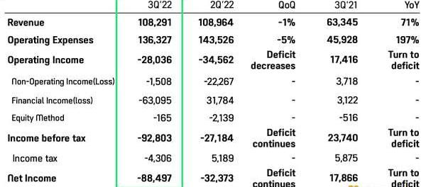 而在Wemade官網最新發布的三季度財報中,公司并未抑制住虧損的勢頭,并由于財務性收入上的損失,使得公司凈收入虧損達到884.97億韓元。