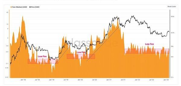 散戶投資者對于確定市場轉型的可持續性往往很重要。在這里,我們可以使用另一種工具,通過觀察支付的交易費用中位數的周平均值,來放大這些投資者對費用市場的影響。這是最有可能歸因于散戶投資者的較小交易費用的代表性指標。