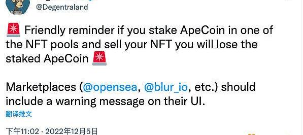在APE質押功能上線前,就已經有大V在推特上提醒參與質押的用戶需要把自己持有的BAYC及其衍生系列NFT從所有NFT市場上下架,否則如果有人購買了你上架的NFT,那么你同時也會失去你質押的APE代幣。