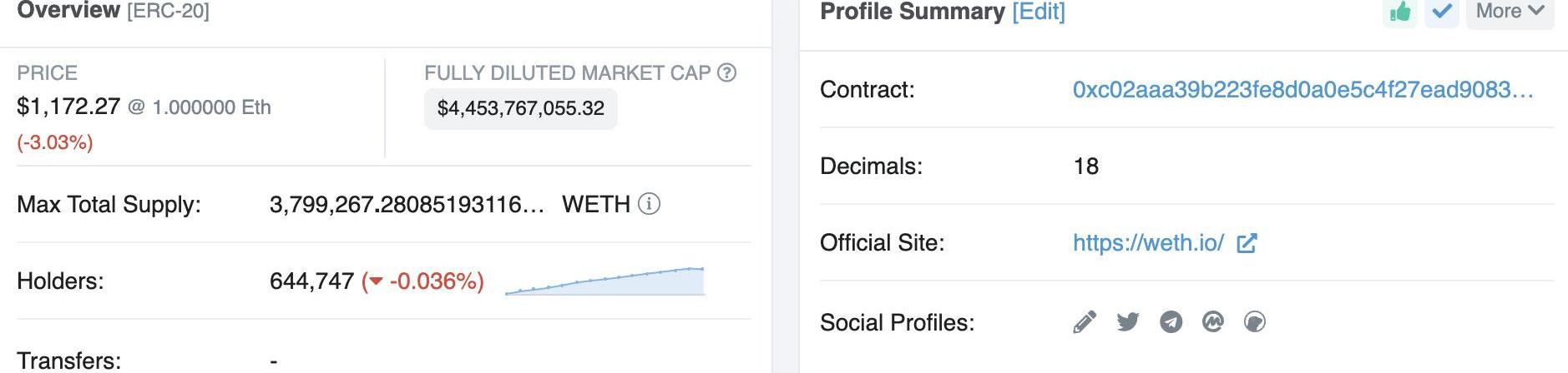 WETH全稱WrappedEther,即為封裝的ETH。將ETH封裝為WETH的合約非常簡單,幾乎不可能出現錯誤。且該合約已經存在多年,保存著數十億美元的ETH,用戶隨時可以1:1地將ETH兌換為WETH,或者將WETH兌換為ETH。常用的Uniswap等DEX也提供了兌換的入口。