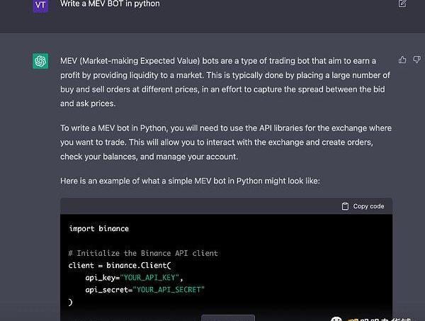 至于繼續讓AI優化代碼的步驟我們就不再重復了,畢竟這次我們只是想了解一下它能不能寫一個邏輯稍微復雜一點的代碼,現在來看,網格機器人是難不倒它了。那么,如果遇到復雜度更高的MEVBOT,它能處理嗎?讓我們輸入“WriteaMEVBOTinpython“,發現得到的MEV機器人并不是我們知道的鏈上maximalextractablevalue,而還是基于Binance的傳統gridtradingbot,這也啟發我們,眼界不要狹隘,MEV可不止鏈上:),這里可以不加編程語言的限定條件,我只是個人比較喜歡python,目前測試下來,chatGPT主要給的代碼版本就是Python和JS。同時這里可以加一些自己喜歡的限定條件進去,無論是withflashbot還是withthegraph,chatGPD都能滿足你的需求。