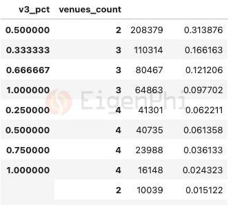 我們可以通過計算涉及的場所數量和涉及的UniswapV3池的百分比來觀察套利交易的結構。前10種可能的組合表明,涉及一個UniswapV3池和另一個場所的空間套利是最常見的模式。隨后的兩種常見模式是涉及一個或兩個UniswapV3池的三角形套利。