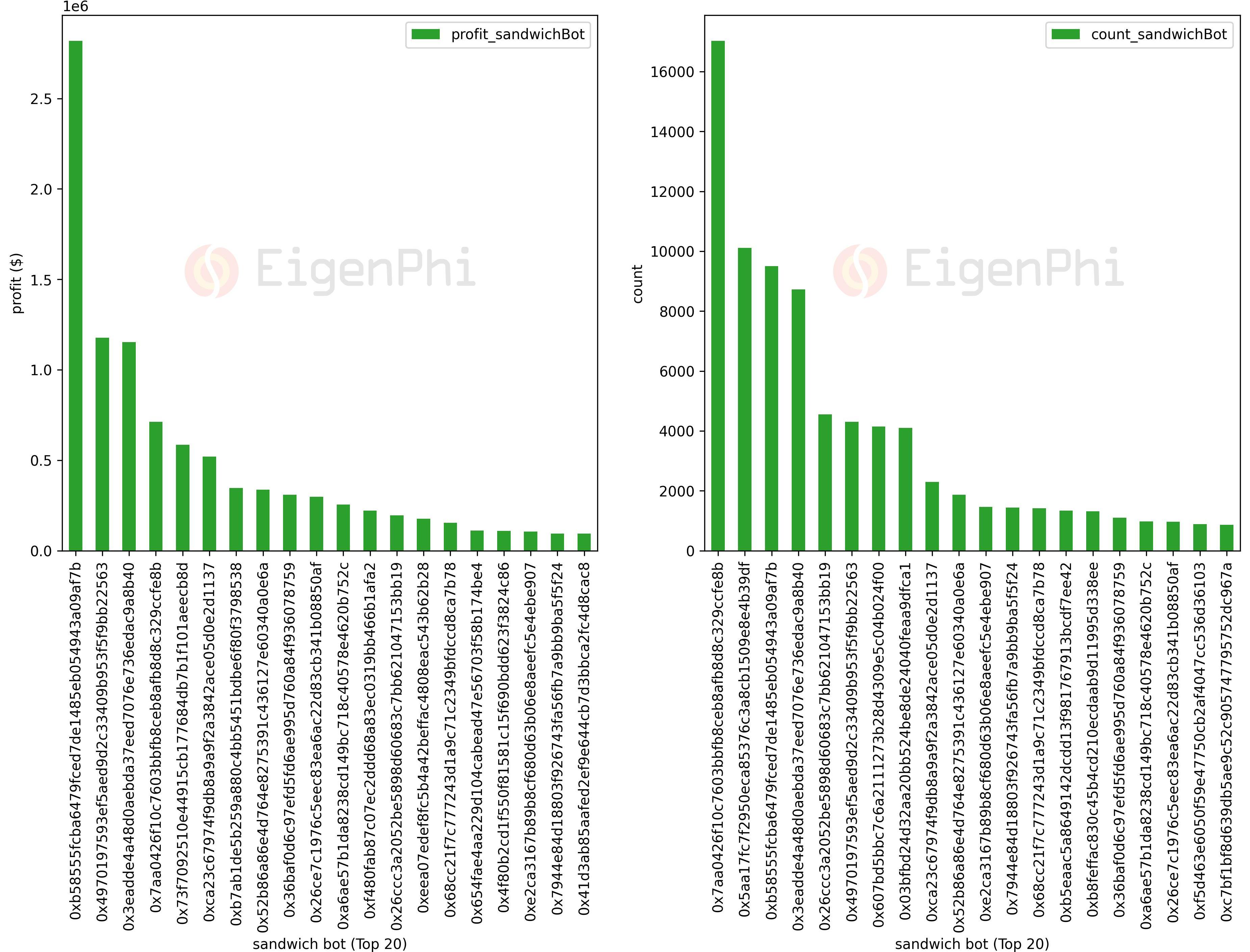 以下面板分別顯示了按總利潤或總活動頻率排序的前20個三明治合約的地址。總利潤和總活動計數之間的關系表明,大多數盈利機器人今年更有能力成功提交超過100次交易。