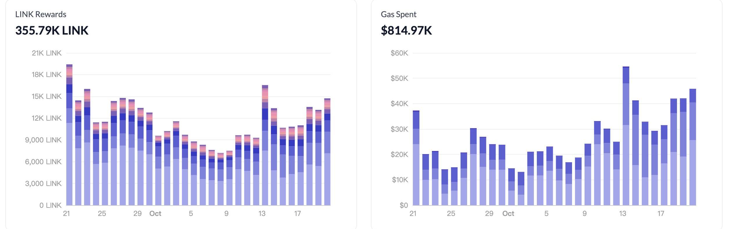 ChainlinkMarket數據顯示,過去30天Chainlink進行了2.94億次喂價更新,完成了39.6萬次VRF請求、52.5萬次直接請求、6萬次Keepers操作,節點獲得了35.6萬LINK獎勵,消耗了81.5萬美元的Gas費,其中約有一半的LINK獎勵和Gas消耗來自于以太坊主網。按照現在的LINK價格6.5美元計算,節點每年獲得的獎勵價值2777萬美元。