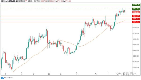 因此在在整整24小時過后,目前BTC所處的位置以及盤面上能夠給出的信息與昨日早盤基本一致,在這種情況下昨日給出的交易跟進思路基本不需要進行任何調整,只要下方9600-9500區域支撐企穩不破則行情上升勢頭穩固,再度回踩該區域不破則行情望很快迎來沖擊萬元大關的機會,回踩上述支撐區域企穩應視作短期內最理想的低多入場機會。除此以外即繼續等待10000上破并給出回踩確認過后再做進一步多單追進,追多目標上看11500附近。
