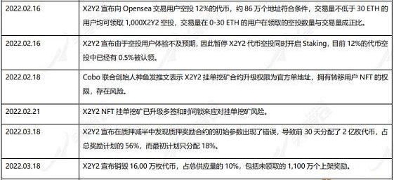 用戶通過質押X2Y2能夠獲得交易費用獎勵和X2Y2代幣獎勵,團隊預計在720天內分發完所有的獎勵,總代幣獎勵中前30天的獎勵最多。在前期開啟質押獎勵活動時,團隊由于智能合約中的參數設置錯誤,導致前30天比原計劃多釋放了總獎勵38%的X2Y2,出現代幣拋售壓力,于是團隊更改了后期釋放計劃,每個階段釋放的X2Y2逐漸減半,實際將釋放2億枚X2Y2。質押獎勵計劃與實際拋售對比如下: