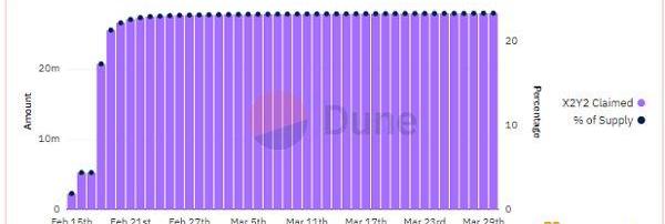 代幣空投活動在開啟三個小時內由于技術原因和用戶體驗不佳,團隊宣布了暫停空投,當時用戶已認領了0.5%的空投份額,隨后48小時內又重啟了空投。空投活動截止到今年4月1日,無人認領的代幣將會被永久鎖定在合約中。截至21年3月30日,共計有36,059個錢包賬戶進行了X2Y2空投認領,總共認領了28,043,778枚X2Y2,詳情如下: