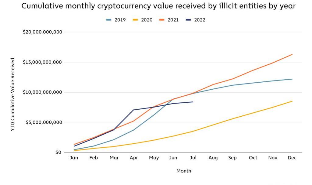 2022年對于加密市場而言,是動蕩的一年,5月和6月所有的加密貨幣價格都出現了大幅下跌。雖然我們無法確定是否已經觸底,但截止8月初,比特幣價格在20000和24000之間相對穩定。本文將要分析市場低迷對加密貨幣的非法活動的影響。