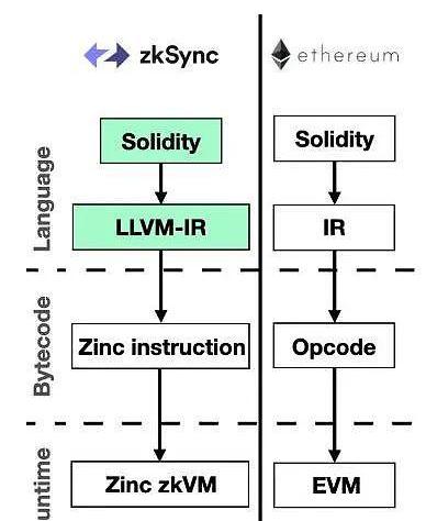 另一個采用這種策略的團隊是zkSync。zkSync創建了自己的VM(SyncVM),它是基于寄存器的,并定義了自己的代數中間表示(AIR)。然后,他們構建了一個專門的編譯器,將Yul(一種中間語言,可以編譯成針對不同EVM版本的字節碼,比如較低級別的Solidity)編譯成LLVM-IR,然后再將LLVM-IR編譯成用于自定義VM的指令。這類似于StarkWare所采取的方法,但它們在基礎語言上提供了更多的靈活性。zkSync團隊最初創建了他們自己的類似于Cairo的語言(Zinc),但是他們將主要精力集中在了Solidity編譯器上,以便L1開發人員能夠更簡單地進行遷移。