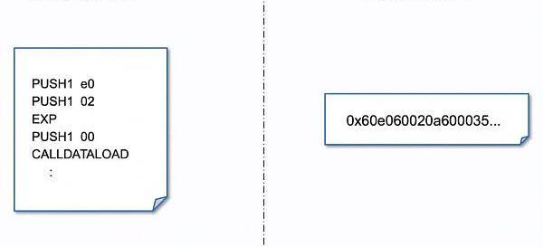 一個EVM程序就是一系列操作碼和參數。當這些程序被表示為一個連續的代碼塊時,我們稱其結果為“字節碼”(通常表示為十六進制字符串)。