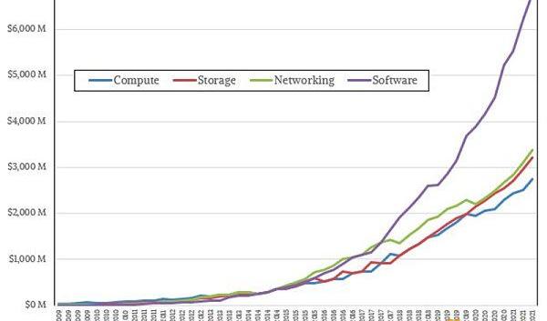 其中,亞馬遜網絡服務公司常年保持行業龍頭地位,2021年收入已經達到了620億美元,約占云服務市場份額的33%。排名第二的是微軟,近年來增長驚人,市場份額已經從2017年的13%提升到2021年的21%。就亞馬遜網絡公司來說,其中四個核心部門分別是:云計算、云存儲、網絡和軟件,各個部門的收入增長情況如下: