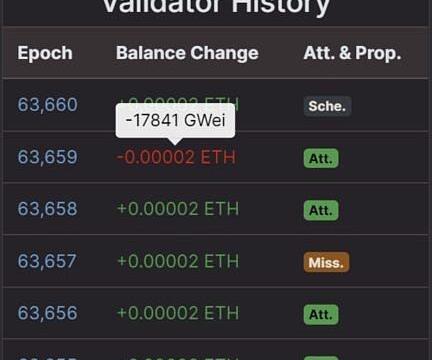 通過觀察信標鏈的區塊鏈瀏覽器我們可以看到,下圖詳細信息顯示該周期被99.8%的活躍驗證者即總質押量13,177,296個ETH中的13,150,835個ETH的權益投票簽名并出塊,每個插槽中的分片區塊都由不同的驗證者出塊并經過三分之二以上活躍驗證者的投票簽名通過出塊。