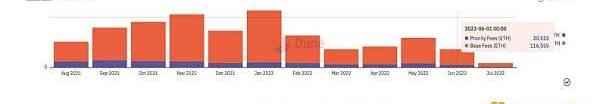 交易的小費約占整體交易費總數的15%,在目前的PoW機制下由礦工賺取。合并后小費將由PoS的質押節點賺取,增加節點的收益。這塊的收益和以太坊網絡的交易活躍度密切相關,去年底NFT最活躍時,網絡整體的交易總費用可以達到1.4萬ETH/天,而目前市場活動低迷期,交易費用下降到約4000ETH/天。